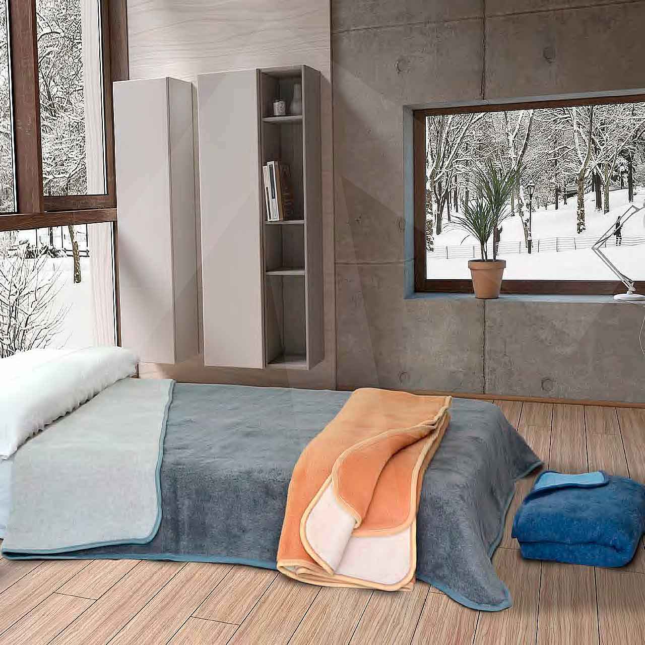 Manta acabada en pelo y reversible, disponible en las siguientes combinaciones de colores; azafata-celeste, beige-paja y gris claro-gris oscuro.